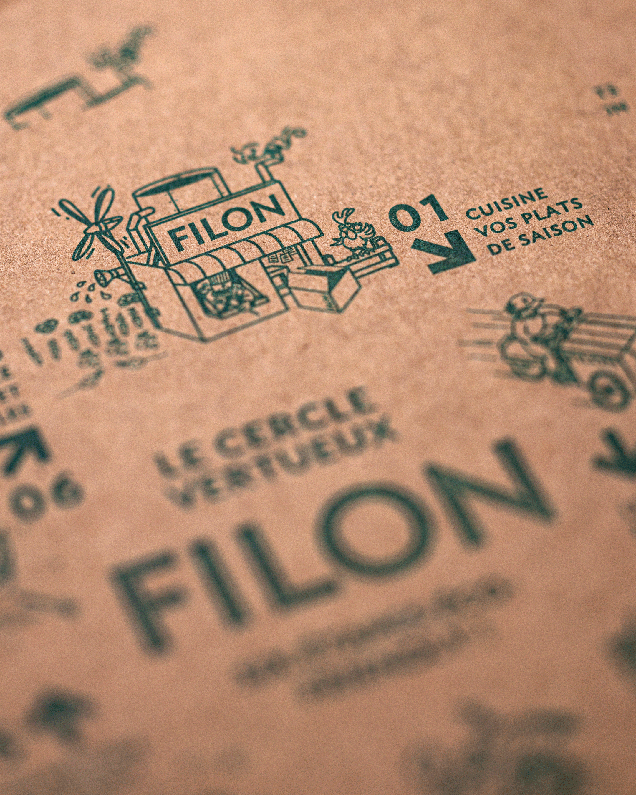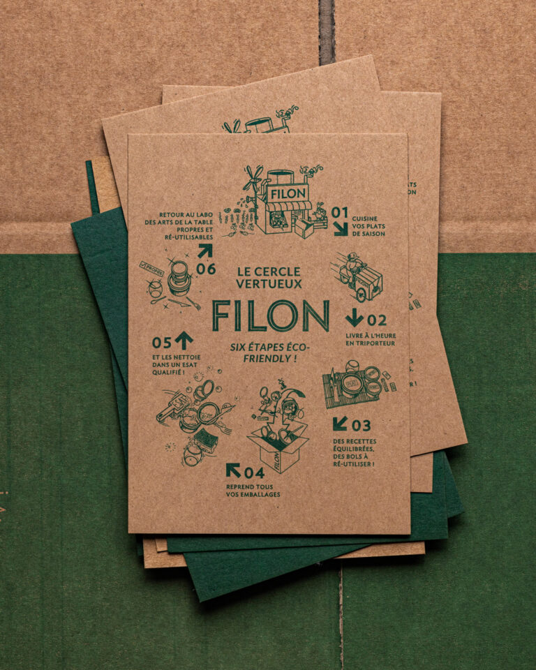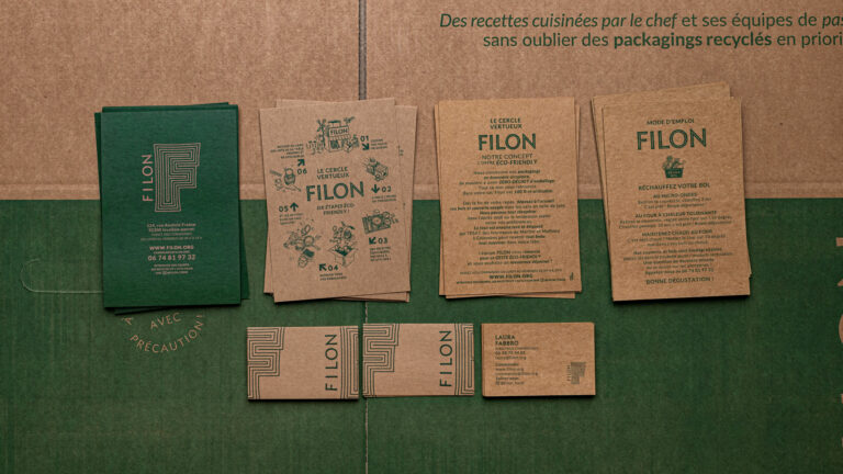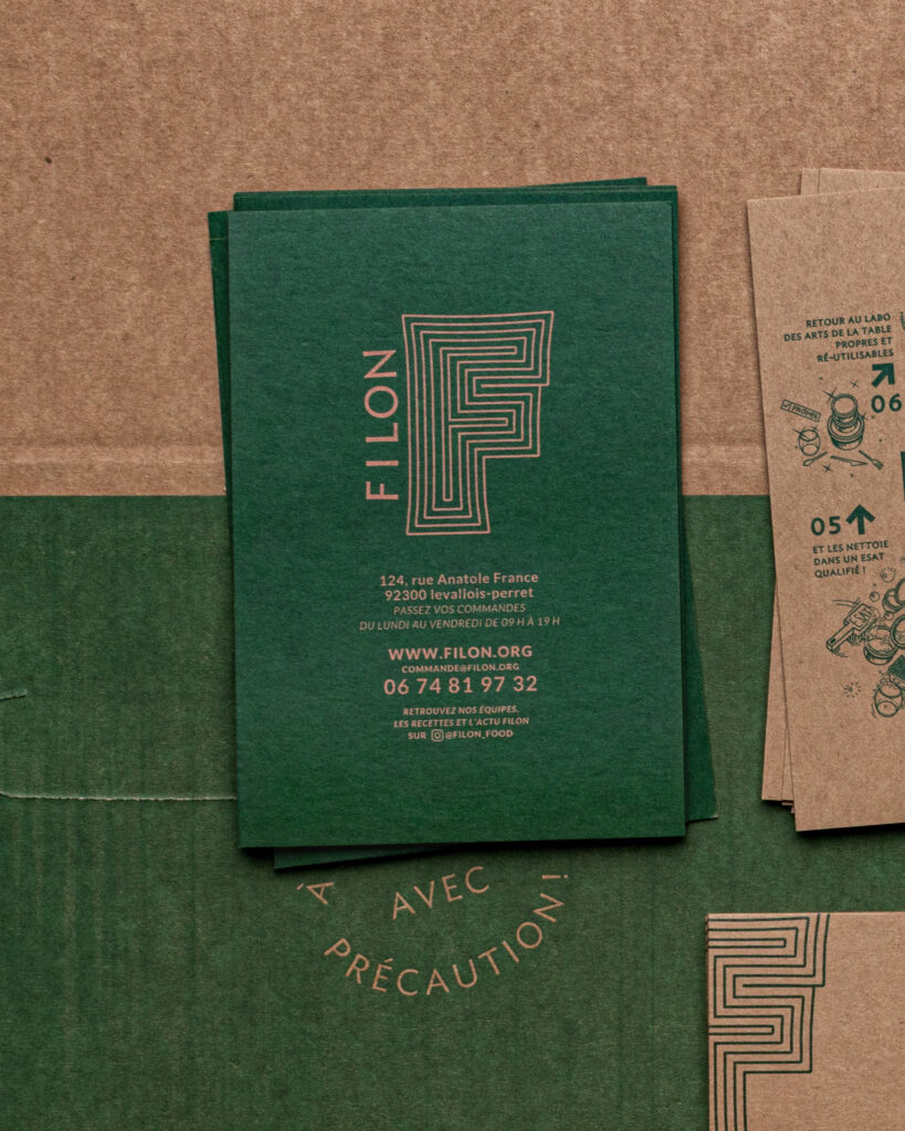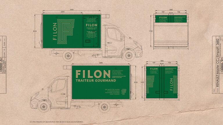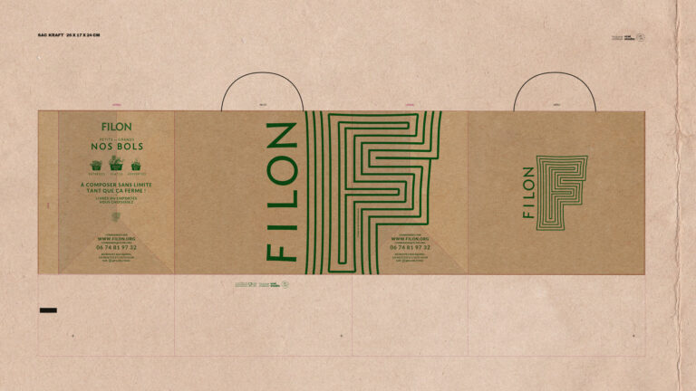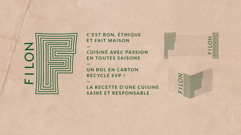 Filon est un traiteur gourmand qui cuisine bon, éthique et fait maison. Nous créons pour eux un monogramme F qui viendra accompagner l’architecture des mobiliers, lieux et supports de proximité de la marque. Au départ, une offre uniquement en livraison – des menus entrée, plats, desserts dans 2 bols en carton recyclé – et depuis, Filon ouvre des restaurants d’entreprise sur Paris et région parisienne