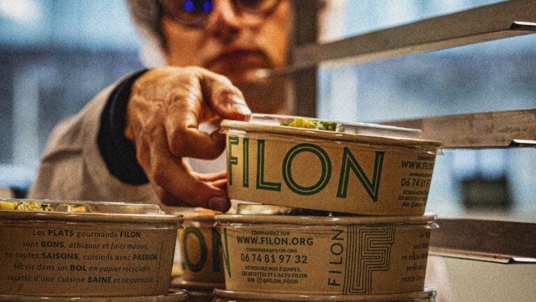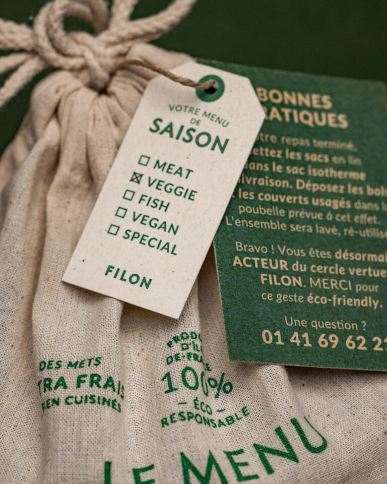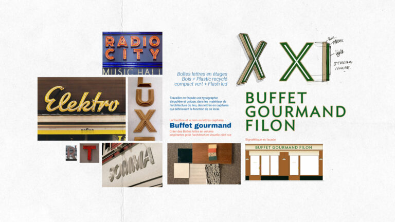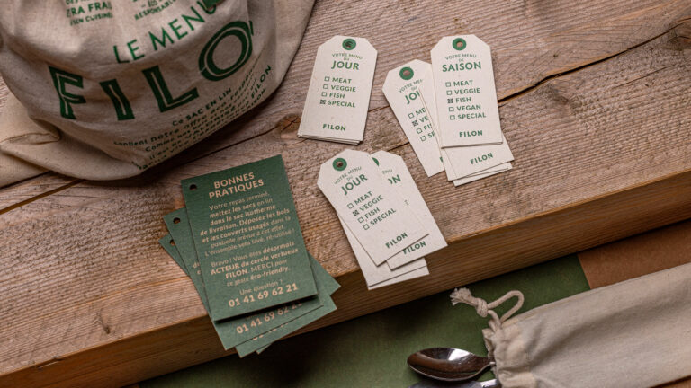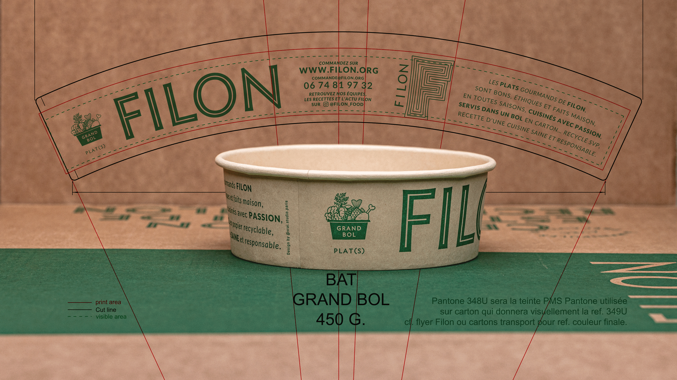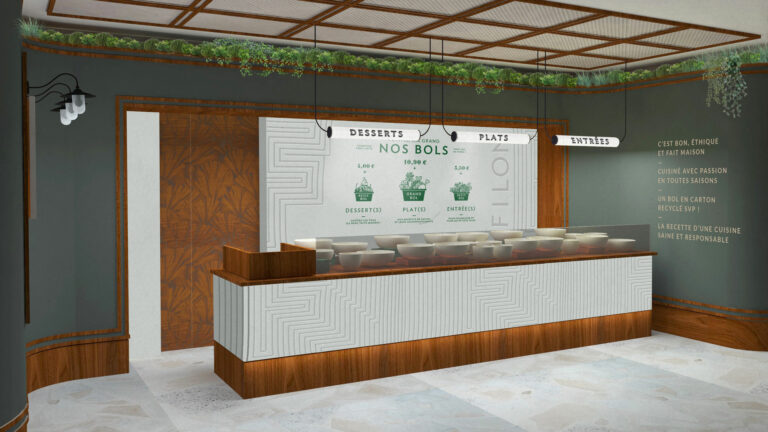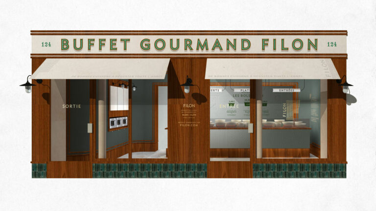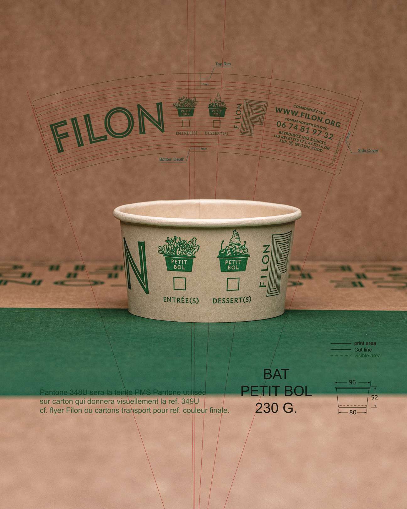 Filon est un traiteur gourmand qui cuisine bon, éthique et fait maison. Nous créons pour eux un monogramme F qui viendra accompagner l’architecture des mobiliers, lieux et supports de proximité de la marque. Au départ, une offre uniquement en livraison – des menus entrée, plats, desserts dans 2 bols en carton recyclé – et depuis, Filon ouvre des restaurants d’entreprise sur Paris et région parisienne