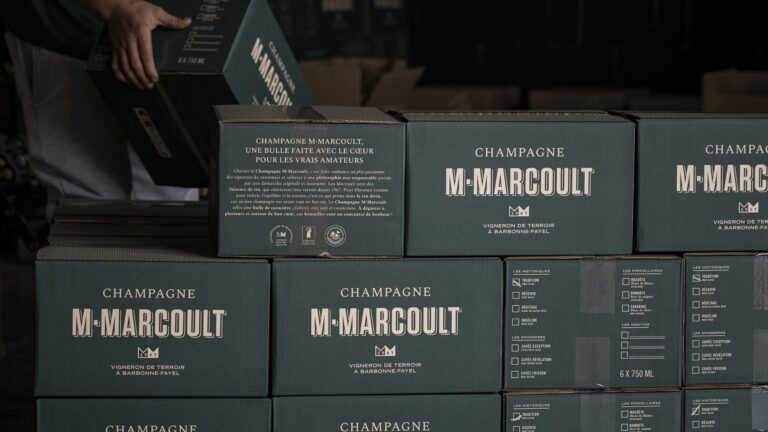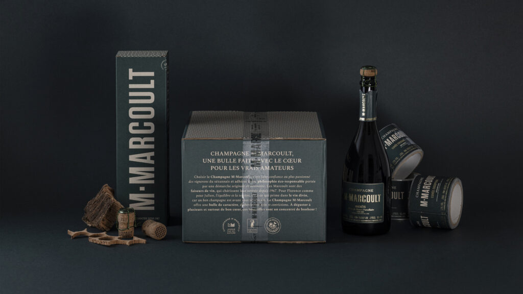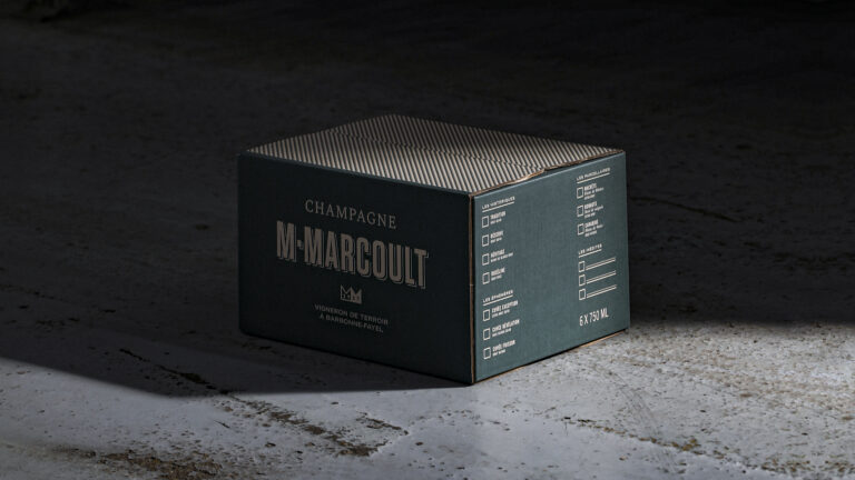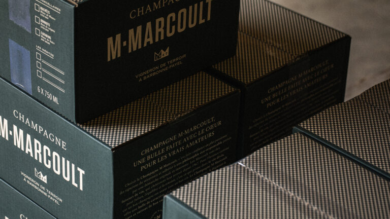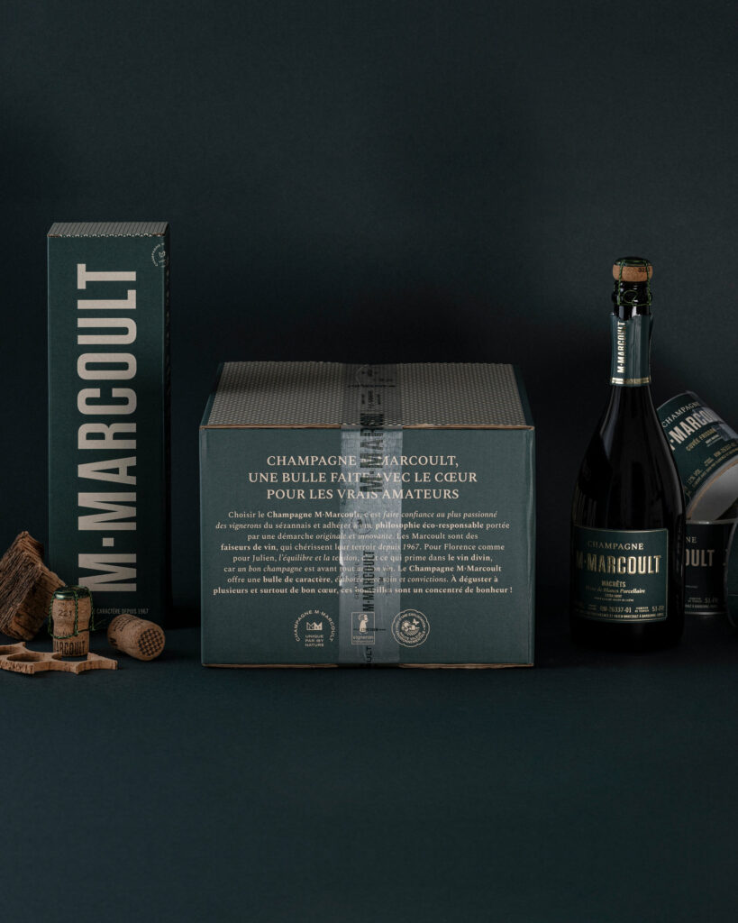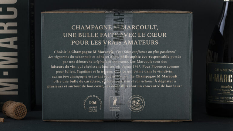 Notre mission : rendre visible la marque dans un univers très concurrentiel. Les clés de cette identité : des couleurs fortes et contrastées, vert vignoble et greige crayères ; un labelling clair avec une hiérarchie d’information soignée